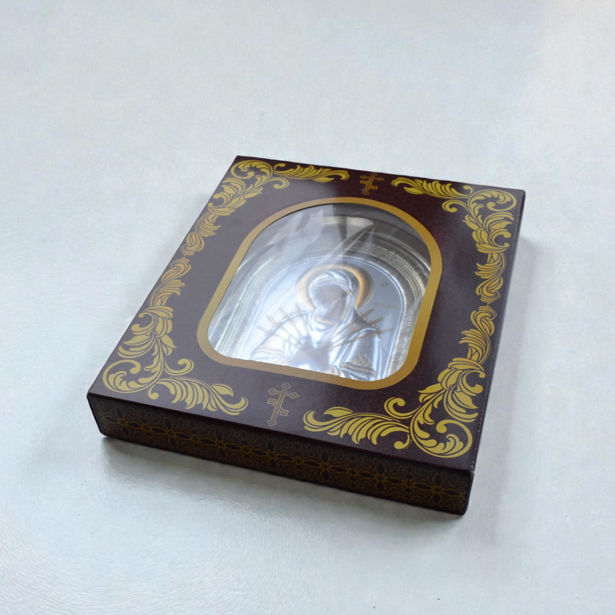 Materjal: Kaarekujuline puidust ikoonikapp, litograafia, hõbetatud reljeefne kate kuldsete detailidega