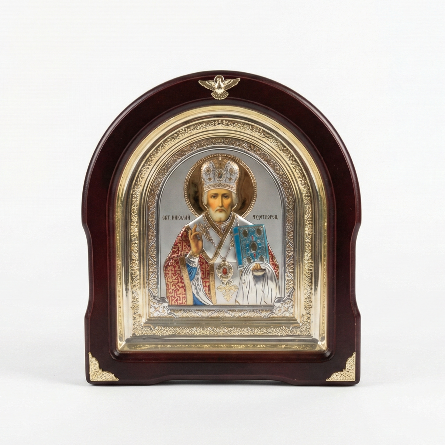 Saint Nicholas is depicted in episcopal vestments, holding the Gospel Book and raising his hand in blessing. The icon is constructed with a lithographic print base and a silver-plated metal overlay, enclosed within an arched wooden kiot frame with decorative gold accents. Intricate patterns are featured across the saint's robes, halo, and ornamental borders on the raised metal surface. As the image represents the patron saint of children, travelers, and sailors, it is suitable for home altars, children's rooms, or prayer corners, and is often chosen as a gift for Saint Nicholas Day or other celebrations.