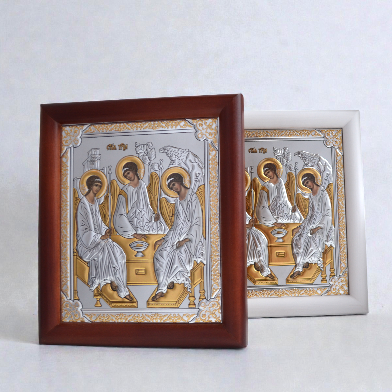 На иконе запечатлен образ Святой Троицы в виде трех ангелов, восседающих за трапезой (сюжет «Гостеприимство Авраама»). Изделие выполнено в технике литографии с наложением рельефного металлического оклада. Икона помещена в деревянный киот. На поверхности оклада выполнены детальные узоры, украшающие одежды и крылья ангелов, нимбы и элементы архитектуры, дополненные золочением и серебрением. Образ представляет центральный догмат христианской веры. Изделие подходит для размещения в молитвенном углу или на домашнем алтаре, а также в качестве подарка к значимым торжествам.
